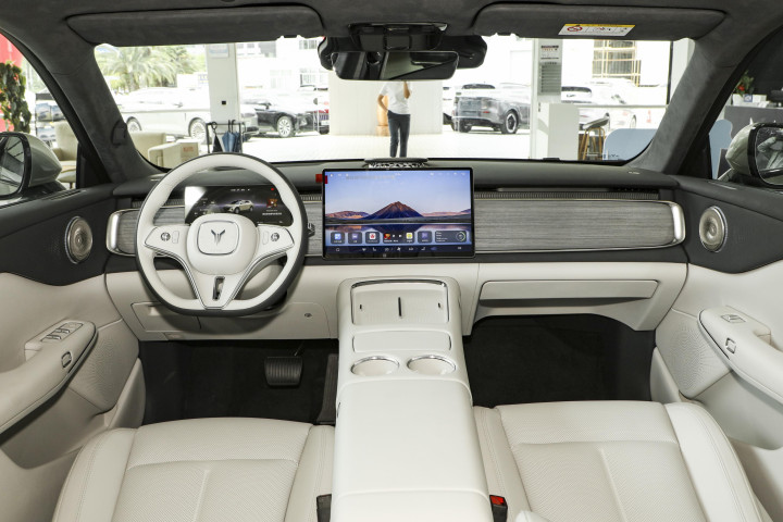 车内用了很多横向平直线条打造,视野开阔,环抱式座舱有着较强的包裹感,内饰配色有深海蓝、旭日红/米色、皓月白三种,色彩搭配素雅温馨上档次。内饰采用大量软性材质包裹,触感细腻,搭配木纹饰板和哑光金属饰条,拼接工艺考究。中控台布局清晰,简化按键化繁为简,怀挡设计释放副仪表台空间,提供手机无线充电和杯架以及储物槽等。